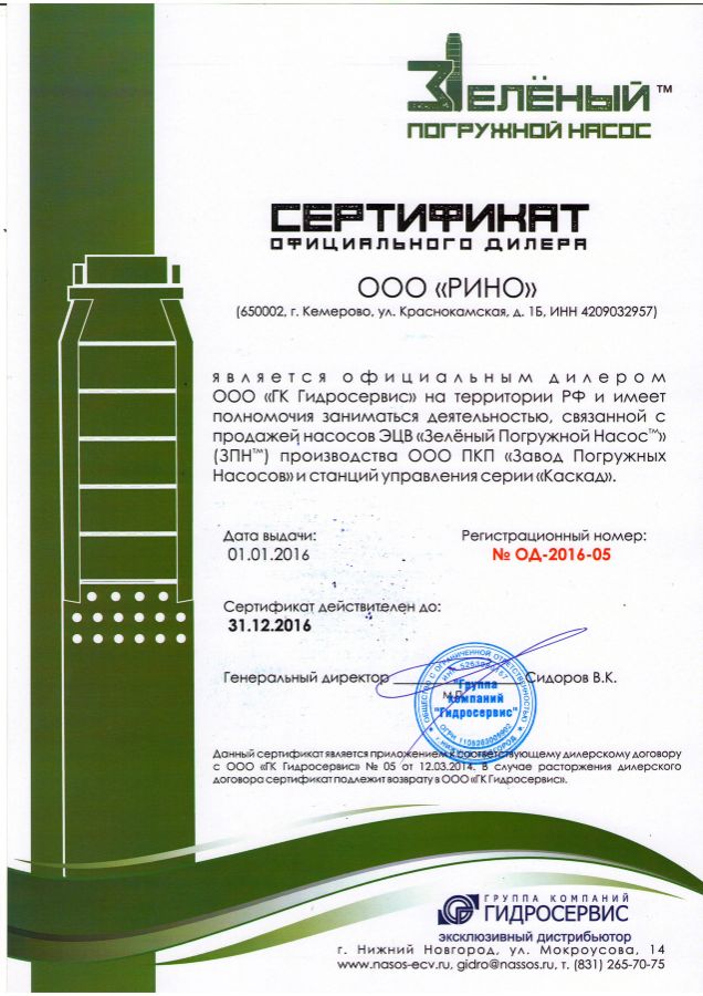Компания Рино является официальным дилером ООО ГК Гидросервис согласно сертификату №ОД-2016-05